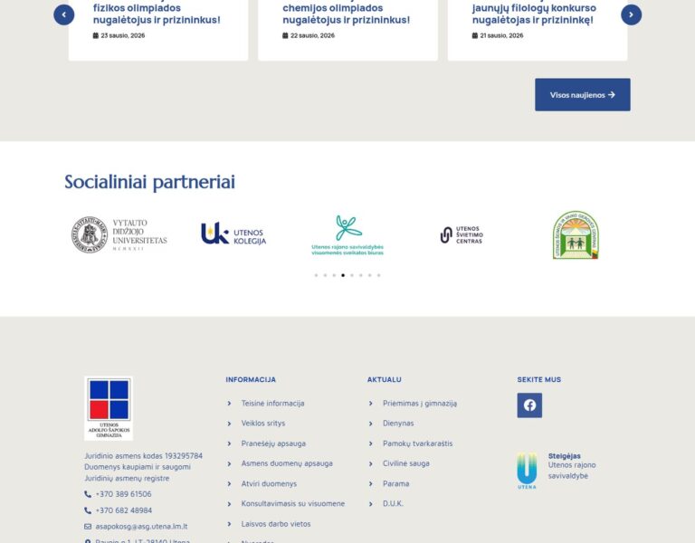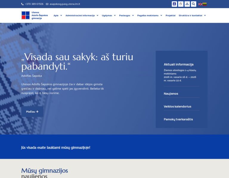Zaprojektowaliśmy i wdrożyliśmy nowoczesną stronę internetową dla Gimnazjum Adolfa Šapokasa w Utenie, aby w przejrzysty sposób przedstawić szkołę uczniom,